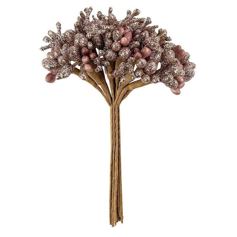 12 świątecznych gałęzi jagodowych wykonanych z tworzywa sztucznego, na drucie, o długości około 11,5 cm, w kolorze różanego złota, niektóre z brokatem.
