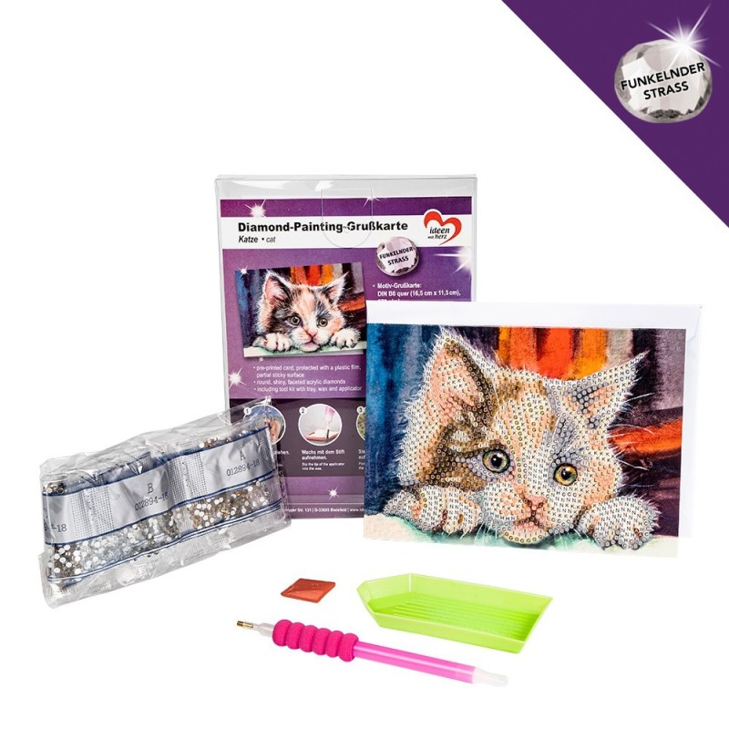 Kartka okolicznościowa z diamentowym malowaniem, KOT, rozm. 16,5 cm x 11,5cm, 370g / m², w tym koperta i narzędzia