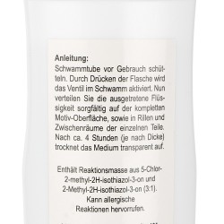 Instrukcje: Przed użyciem wstrząśnij tubką z gąbką. Ściśnięcie butelki aktywuje zawór w gąbce. Teraz ostrożnie rozprowadź wyciekający płyn po całej powierzchni motywu i wciśnij go w rowki i przestrzenie w poszczególnych częściach. Po około 4 godzinach (w zależności od grubości) podłoże wysycha transparentnie.