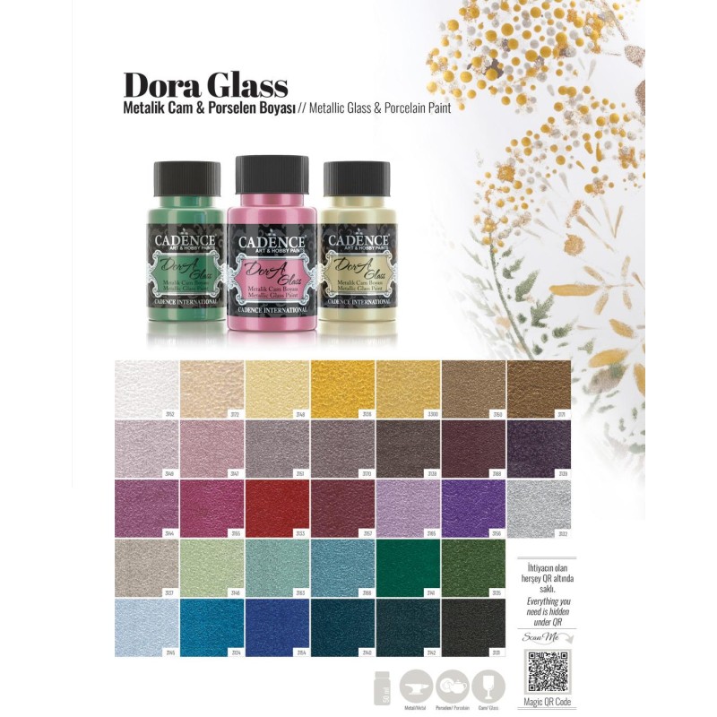 Farba metaliczna do szkła i porcelany na bazie wody, o żywej barwie z brokatowym połyskiem. Przed malowaniem oczyścić szklaną powierzchnię z tłuszczu za pomocą alkoholu lub środka do mycia szyb. Wstawić do piekarnika na 20 min (180 stopni C) lub suszyć naturalnie przez 21 dni. pomalowany produkt umieszczamy w zimnym piekarniku i wyjmujemy wystudzony. Można myć w zmywarce na górnej półce Nietoksyczna