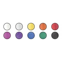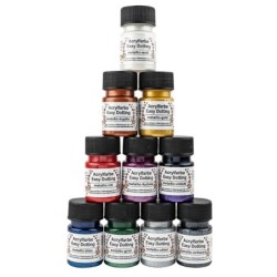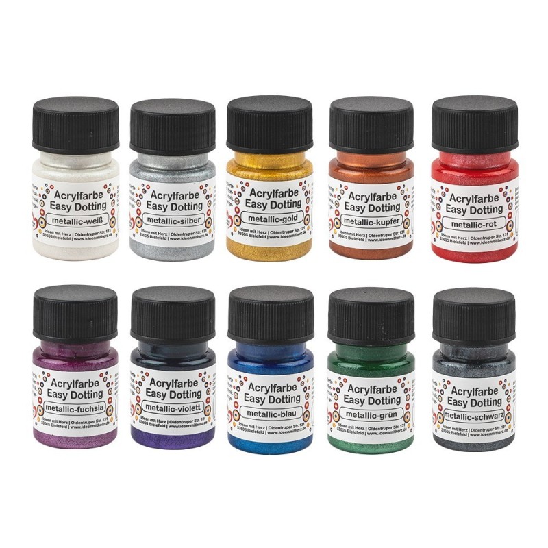 10 butelek farb akrylowych Easy Dotting metalizowanych w 10 różnych kolorach (perłowy, złoty, srebrny, miedziany, czerwony, zielony, niebieski, cyklamen, fiolet, czarny), każda butelka po 30 ml.
