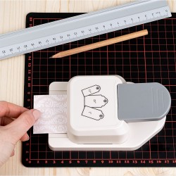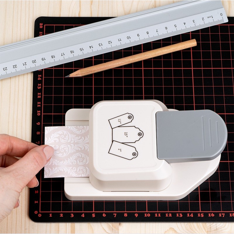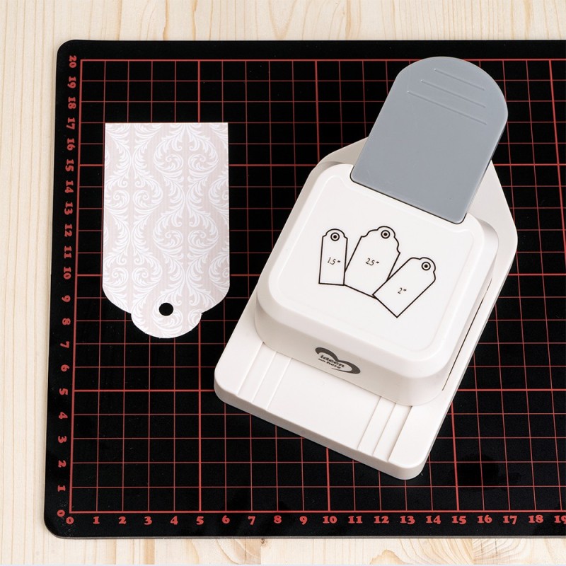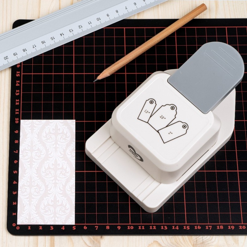 Dzięki dziurkaczowi możesz wyciąć dowolny papier (najlepiej między 180 a 220 g / m²) i wyciąć ozdobne wisiorki w trzech różnych szerokościach (3,8 cm, 5,1 cm i 6,3 cm). Jest to możliwe poprzez nałożenie papieru na różne szyny prowadzące. Wystarczy pociąć żądany papier na paski o określonych szerokościach, a następnie umieścić je w dziurkaczu w celu perforacji.