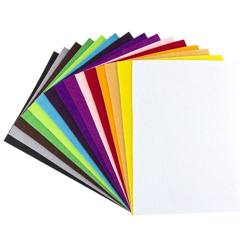 15 arkuszy kolorowego filcu o grubości 2 mm. Do tworzenia pięknych ozdób filcowych z dziećmi.
