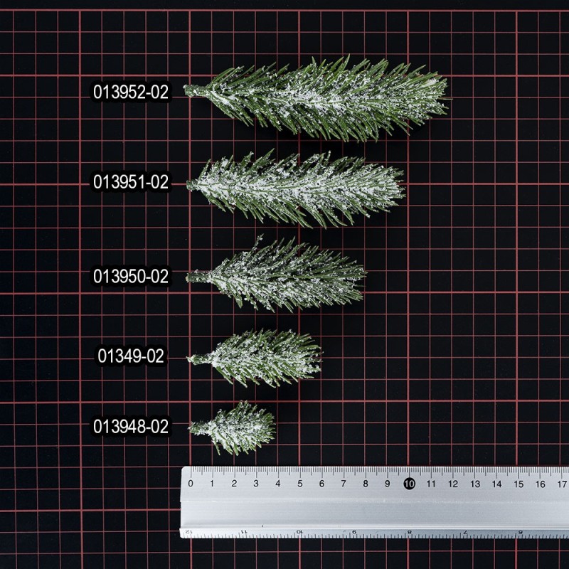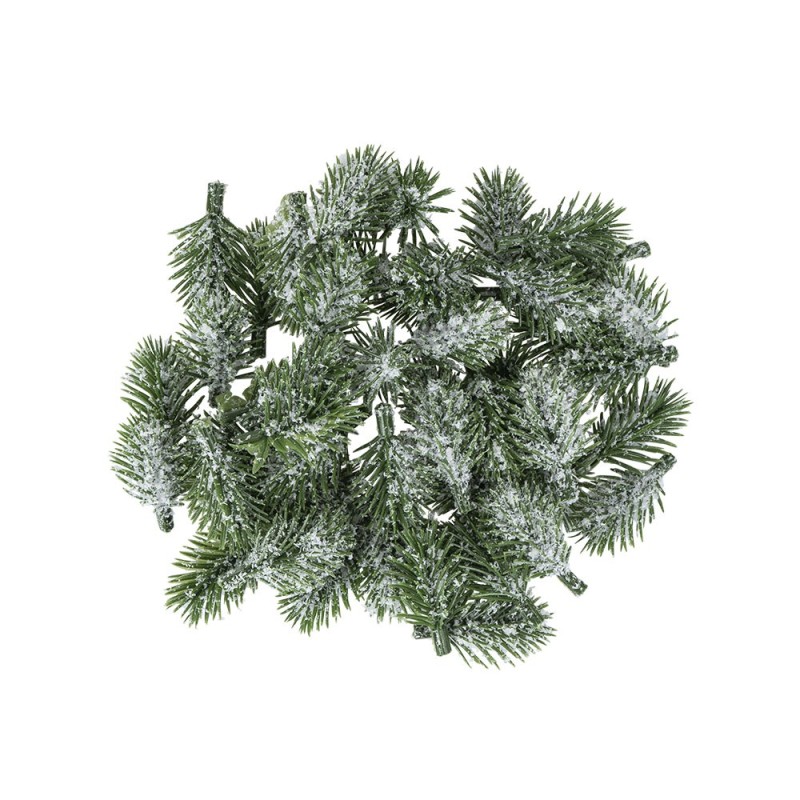 50 ozdobnych gałązek jodłowych wykonanych z tworzywa sztucznego, zielonych, pokrytych śniegiem, o długości 4 cm.