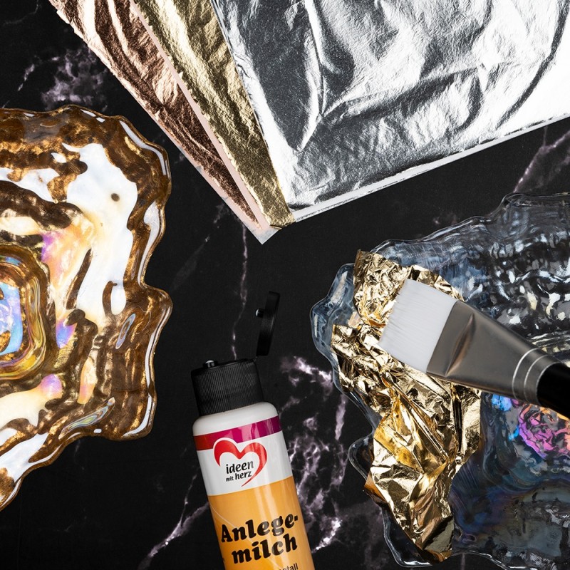 Nałóż warstwę kleju do złoceń, gdy zrobi się transparentny miękkim i suchym pędzlem nakładaj arkusze złota, srebra lub miedzi. Można zabezpieczyć lakierem plus do złoceń.
