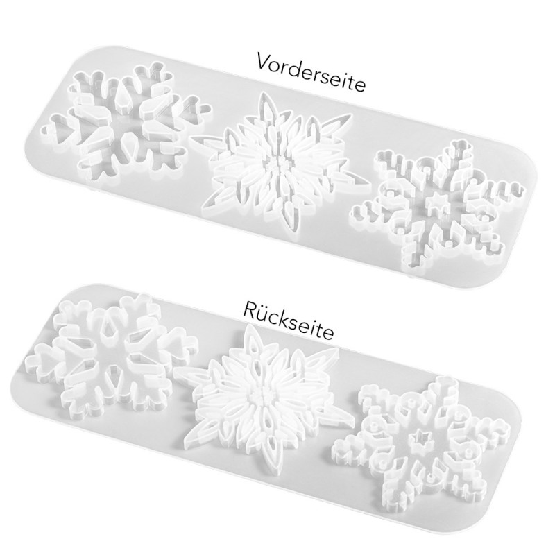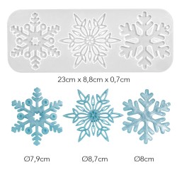 Silikonowa foremka wzór śnieżynki, rozmiar śnieżynek: Ø 7,9 cm, Ø 8,7 cm, Ø 8 cm.