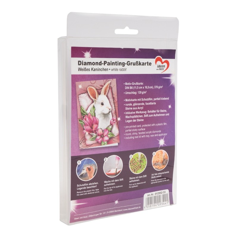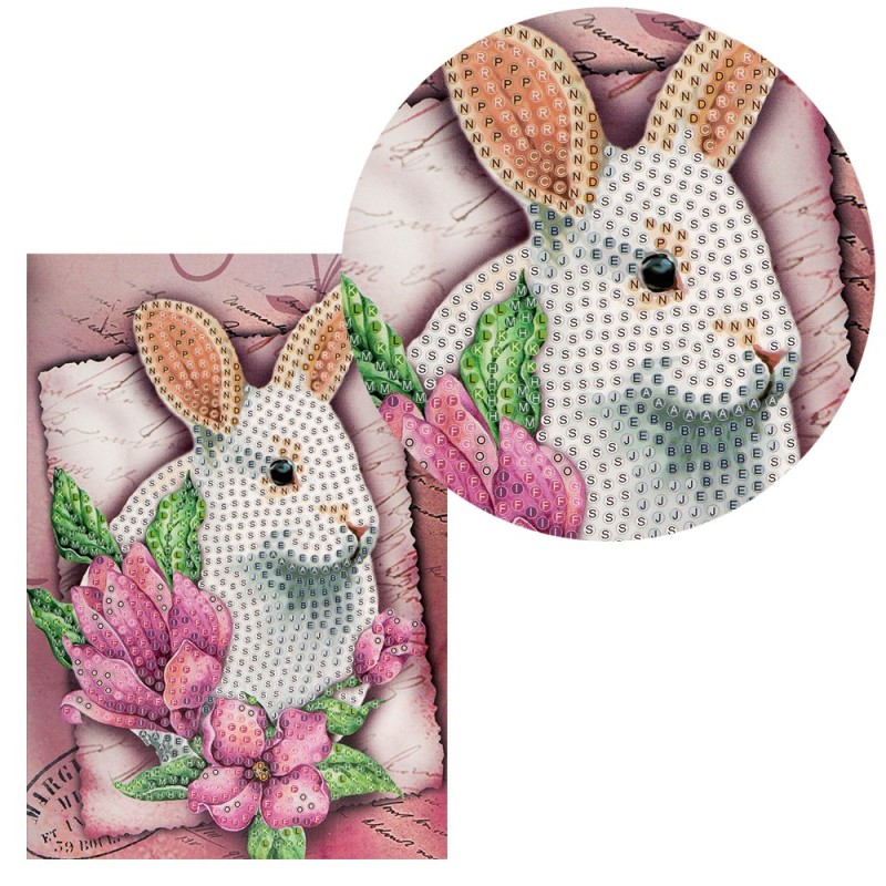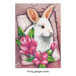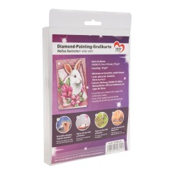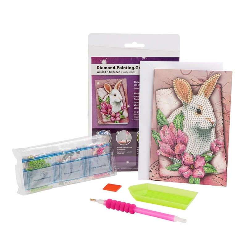 Kartka okolicznościowa z diamentowym malowaniem, Biały Zając, 11cm x 16,5cm, 370g / m², w tym koperta i narzędzia