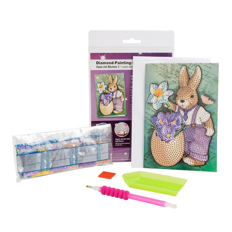 Kartka okolicznościowa z diamentowym malowaniem, Zając z kwiatami, 11cm x 16,5cm, 370g / m², w tym koperta i narzędzia