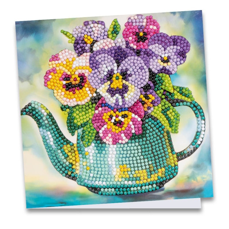 Kartka okolicznościowa z diamentowym malowaniem, Dzbanek z bratkami 16cm x 16cm, 370g / m², w tym koperta i narzędzia