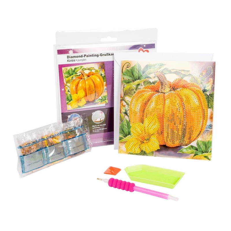Kartka okolicznościowa z diamentowym malowaniem, Dynia, 16cm x 16cm, 370g / m², w tym koperta i narzędzia
