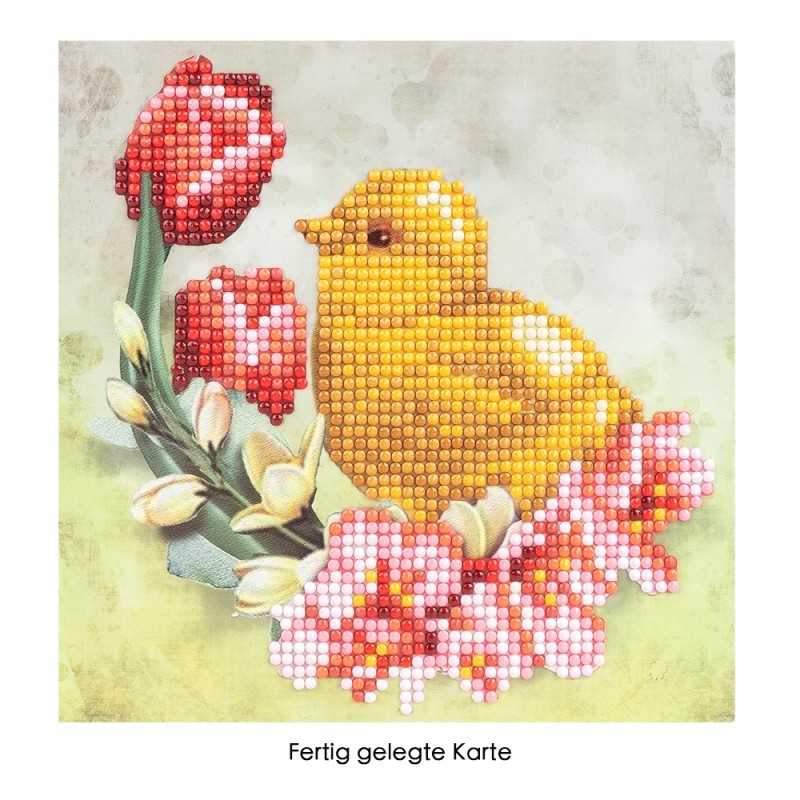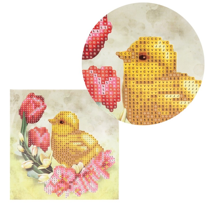 Diamentowa kartka świąteczna – kurczak z kwiatami16 × 16 cm, 370 g/m², w zestawie koperta i narzędzia