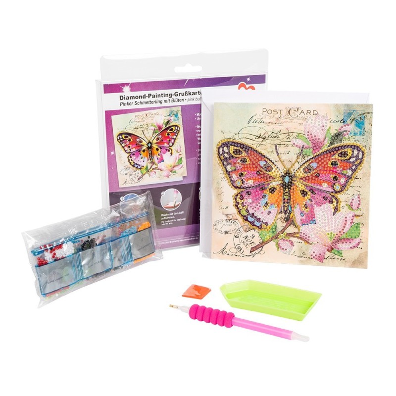 Kartka okolicznościowa z diamentowym malowaniem, Motyl z magnolią, 16cm x 16cm, 370g / m², w tym koperta i narzędzia