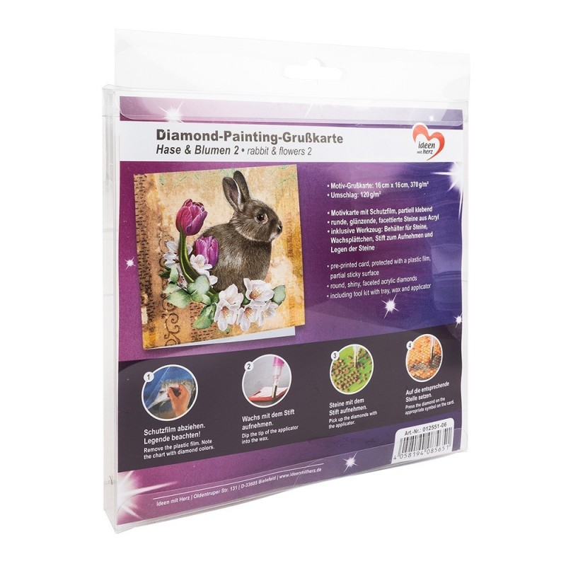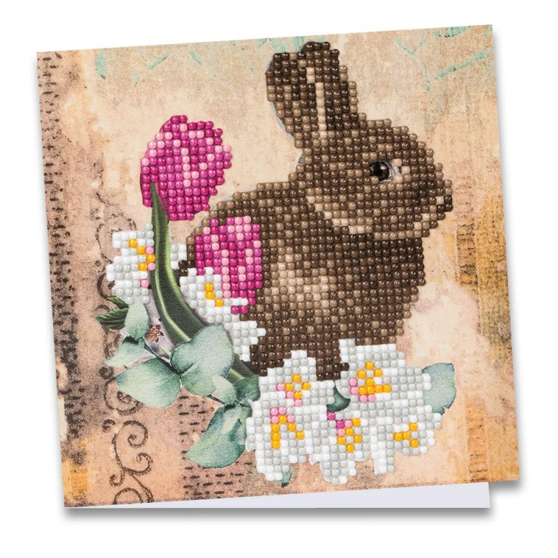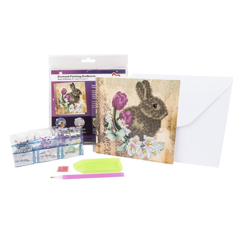 Kartka okolicznościowa z diamentowym malowaniem, Zajac z kwiatami, 16cm x 16cm, 370g / m², w tym koperta i narzędzia