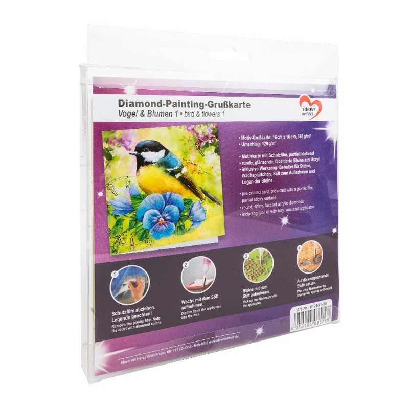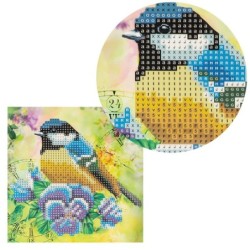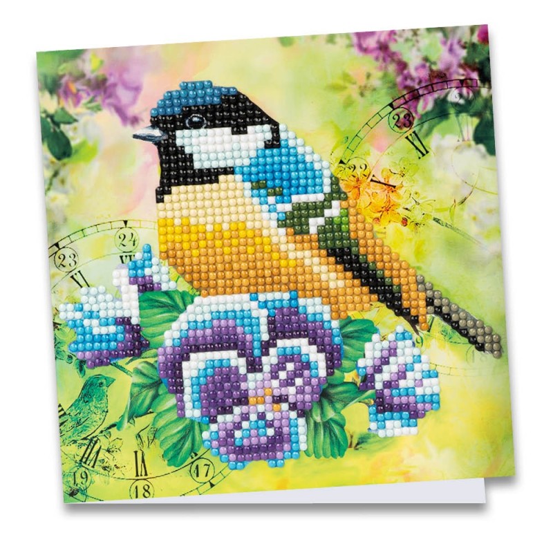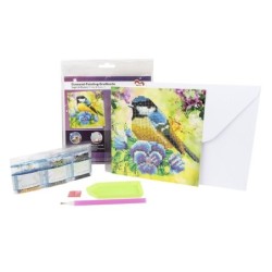 Kartka okolicznościowa z diamentowym malowaniem, Sikorka z bratkami16cm x 16cm, 370g / m², w tym koperta i narzędzia