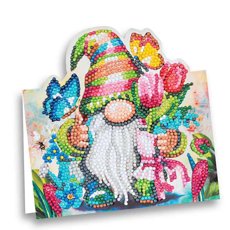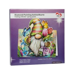 Diamentowa karta do malowania, wiosenny krasnal, 16,3 cm x 16 cm (rozłożona: 16,3 cm x 23 cm), 370 g/m², z dopasowaną białą kopertą (17 cm x 17 cm, 120 g/m²) i narzędziami (pojemnik na kamienie, woskowe talerze, długopis do podnoszenia i układania kamieni)