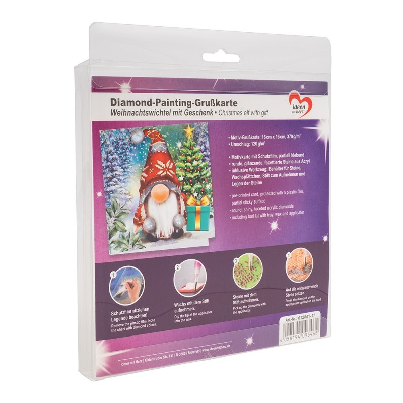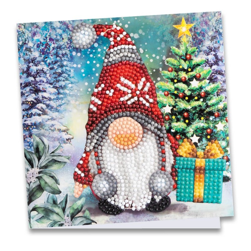 Kartka okolicznościowa z diamentowym malowaniem, Świąteczny Krasnal 16cm x 16cm, 370g / m², w tym koperta i narzędzia