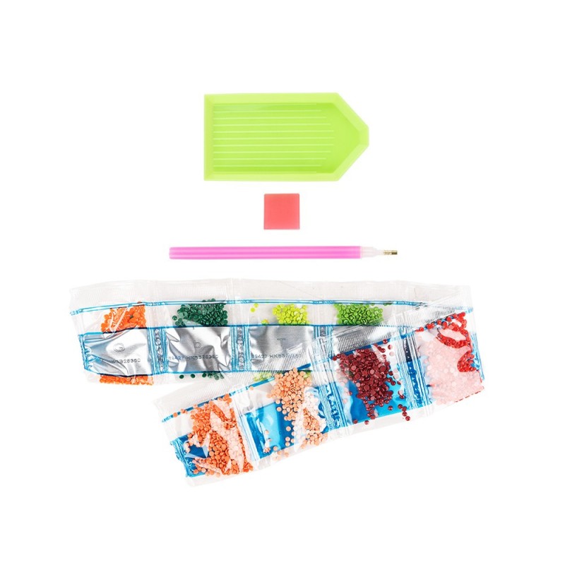 Ten kompletny zestaw zawiera wszystko, czego potrzebujesz: wysokiej jakości kartkę o gramaturze 370 g/m², elegancką kopertę, kolorowe kamienie akrylowe oraz narzędzia do ich aplikacji.