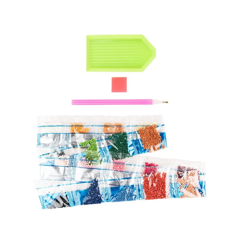 Ten zestaw zawiera wszystko, czego potrzebujesz, aby rozpocząć swoją przygodę z diamentowym haftem: wysokiej jakości kartkę o gramaturze 370 g/m², kopertę, kolorowe kamienie akrylowe oraz praktyczne narzędzia do ich aplikacji.
