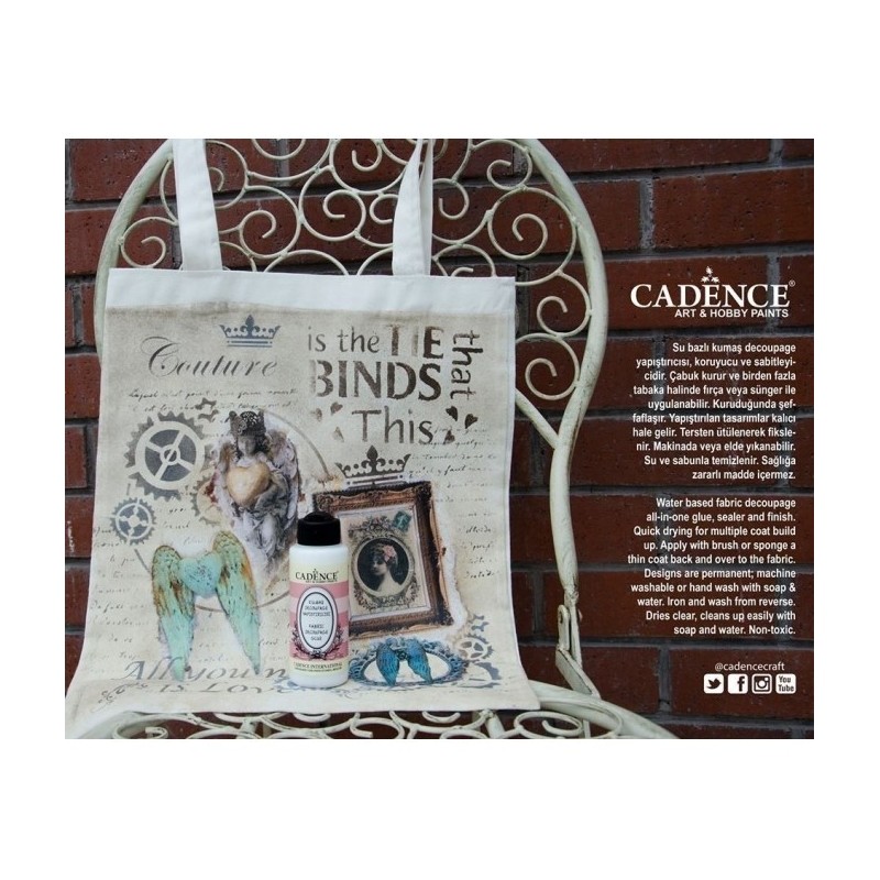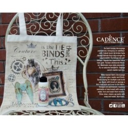 Klej i lakier do zdobienia tkanin techniką decoupage. Zdobioną tkaninę smarujemy klejem, nakładamy wycięte wzory. Następnie ponownie nakładamy klej w to miejsce. Po całkowitym wyschnięciu prasujemy naniesione wzory po lewej stronie żelazkiem przez ok. jedną minutę. Produkt na bazie wody.
