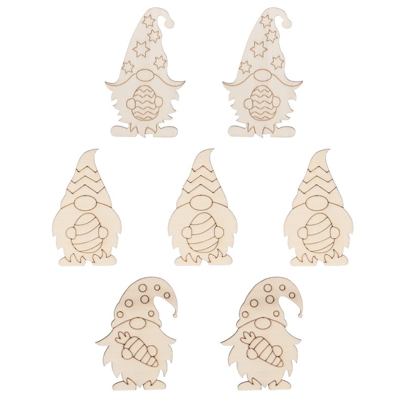 7 drewnianych krasnali, różne wzory, wysokość 10 cm, grubość 2,5 mm.