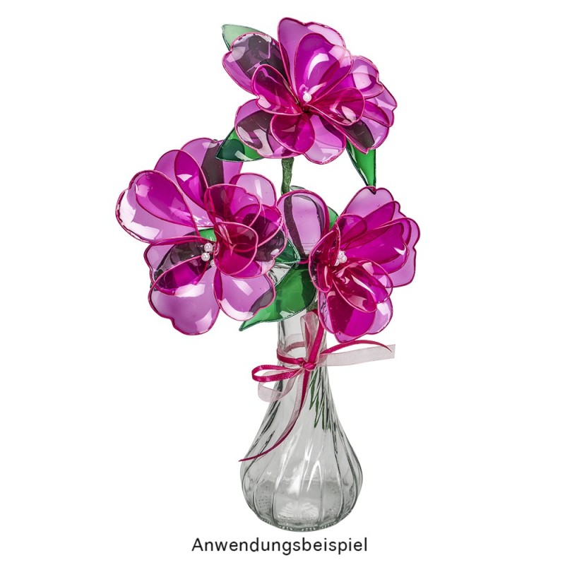 Użyj form do gięcia i odlewania, aby stworzyć piękne róże o wyrafinowanym wyglądzie szkła! Aby to zrobić, najpierw należy wziąć drut i umieścić go wokół formy do gięcia. Przyciśnij mocno do foremki, a następnie skręć końce razem. Następnie można wyjąć powstały arkusz drutu z formy do gięcia i umieścić go w odpowiedniej formie odlewniczej. Teraz wypełnij formę jednym lub kilkoma kolorami medium dającego efekt szkła. Po upływie 12–24 godzin suszenia liść można wyjąć z formy. Na jeden kwiat róży potrzeba od 16 do 24 płatków.