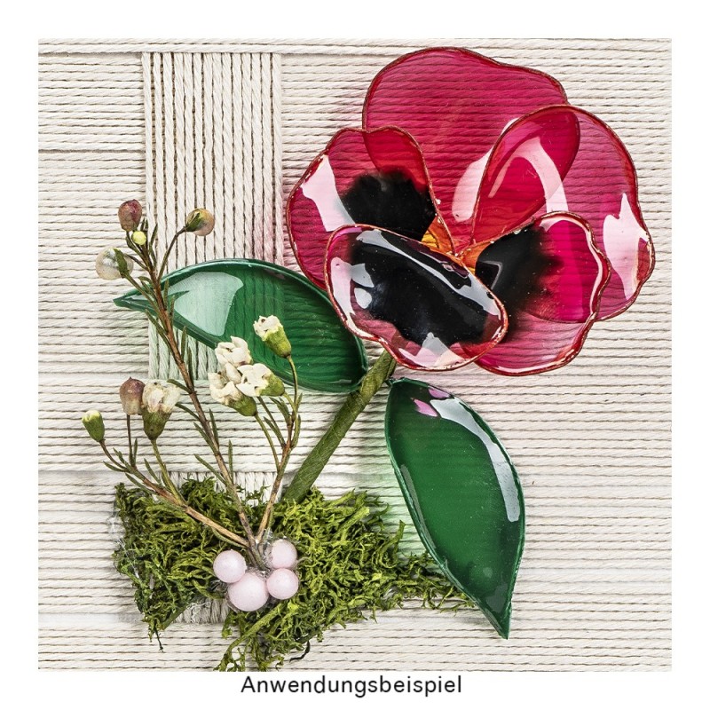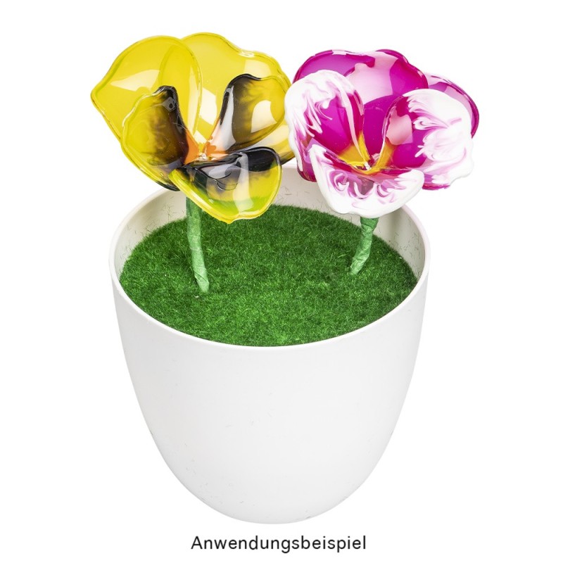 Użyj form do gięcia i odlewania, aby stworzyć piękne bratki o wyrafinowanym wyglądzie szkła! Aby to zrobić, najpierw należy wziąć drut i umieścić go wokół formy do gięcia. Przyciśnij mocno do foremki, a następnie skręć końce razem. Następnie można wyjąć powstały arkusz drutu z formy do gięcia i umieścić go w odpowiedniej formie odlewniczej. Teraz wypełnij formę jednym lub kilkoma kolorami medium do kwiatów witrażowych. Po upływie 12–24 godzin suszenia liść można wyjąć z formy. Na jeden kwiat bratka potrzeba około 4-5 płatków.
