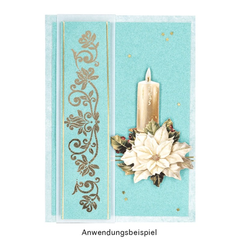 10 świątecznych, wyciętych motywów 3D "Świece bożonarodzeniowe", wykończonych lakierem mikowym w kolorze złotym, ok. 6,5 cm do 9,5 cm.