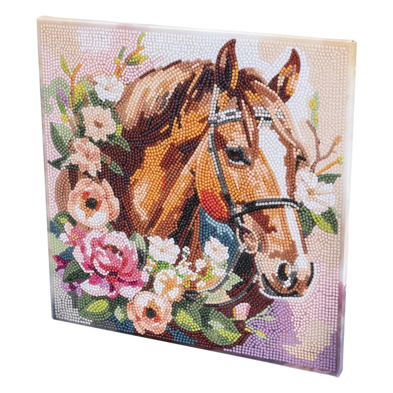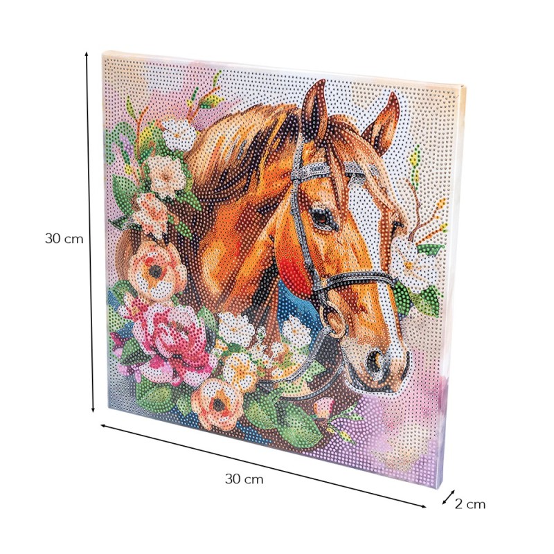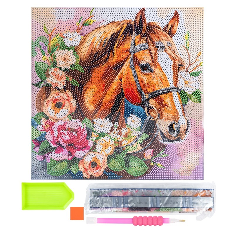 Obraz malowany diamentem na blejtramie, Koń, 30 cm x 30 cm, wraz z narzędziami i fasetowanymi kamieniami z akrylu.