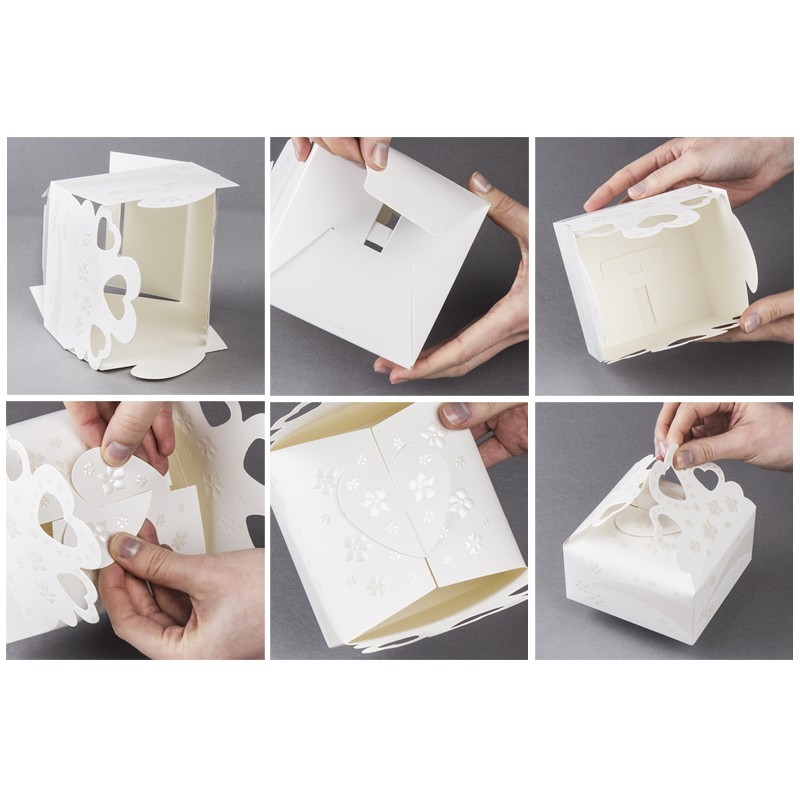 Białe pudełeczko prezentowe z tłoczonym kwiatowym wzorem i wyciętymi sercami – 11 x 11 x 5 cm