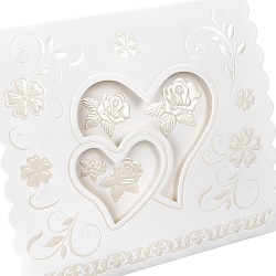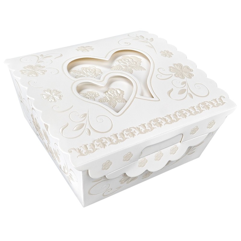 Eleganckie białe pudełeczko prezentowe o wymiarach 11 cm x 11cm x 5 cm, idealne na drobne upominki, biżuterię, słodycze lub podziękowania dla gości. Pudełko wykonane z wysokiej jakości papieru, zdobione perłowym, tłoczonym wzorem kwiatowym, który nadaje mu wyjątkowego, luksusowego charakteru. Górna część wieczka ozdobiona została wycięciami w kształcie dwóch serc, co sprawia, że pudełko doskonale sprawdzi się na ślub, chrzest, komunię, urodziny czy Walentynki.
