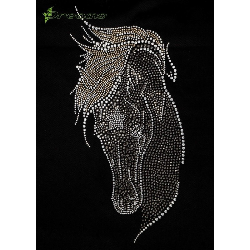 Dodaj elegancji i charakteru swoim ubraniom lub akcesoriom dzięki dekoracyjnej aplikacji Hot-Fix przedstawiającej głowę konia, zdobionej błyszczącymi kamieniami.