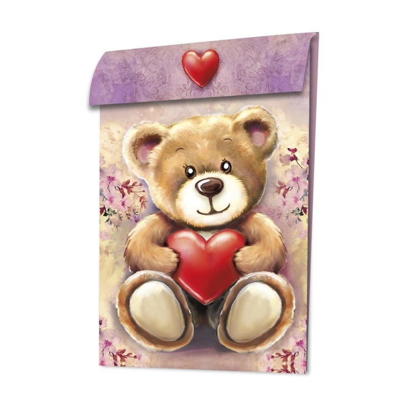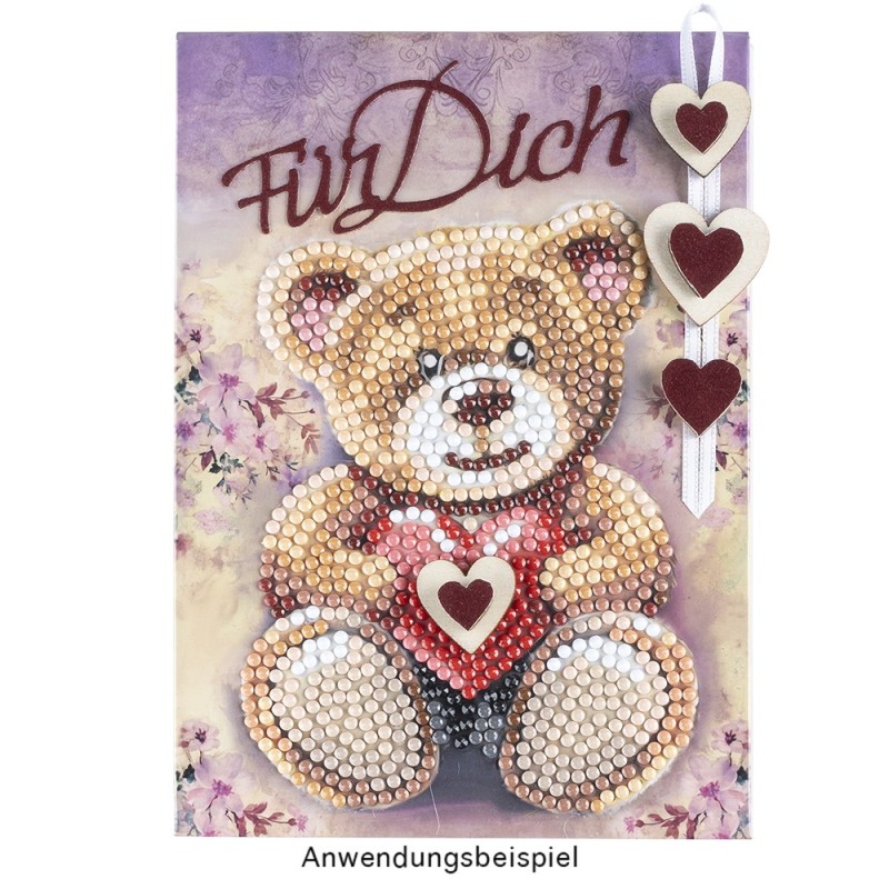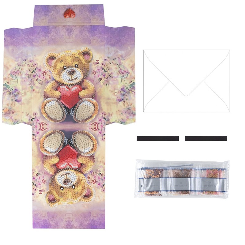 Torebka prezentowa w formie kartki z obrazem diamentowym, Miś, gramatura 370 g/m², wysokość 36,5 cm, zawiera kopertę i pasek magnetyczny. Twórz wyrafinowane torby na prezenty w praktycznym formacie kartki okolicznościowej z pięknymi motywami malarstwa diamentowego. Otrzymasz również pasujące koperty, dzięki którym będziesz mógł od razu wysłać swoje gotowe dzieła sztuki. Aby wykonać torby na prezenty, wykonaj następujące czynności: Rozłożona torba na prezenty jest całkowicie pokryta folią ochronną, która chroni zarówno powierzchnie, które mają być pokryte kamieniami, jak i samoprzylepne zakładki po bokach. Aby móc ułożyć motyw, należy przeciąć folię na nieprzylepnym obszarze pomiędzy motywem a zakładkami samoprzylepnymi po lewej i prawej stronie. Teraz możesz odklejać folię z motywu kawałek po kawałku podczas nakładania kamieni, a samoprzylepne paski po bokach pozostaną chronione. Następnie całkowicie pokryj oba motywy kamieniami szlachetnymi. Aby to zrobić, wybierz kamienie, które chcesz umieścić zgodnie z nazwą. Każdemu wydrukowanemu numerowi przypisany jest odcień koloru. Usuń folię ochronną z motywu kawałek po kawałku i przykryj samoprzylepną powierzchnię kamieniami. Jeśli chcesz, możesz trwale umieścić kamienie za pomocą naszego najwyższej jakości uszczelniacza do kryształków. Po całkowitym rozłożeniu obu motywów złóż kartkę z życzeniami wzdłuż wstępnie rowkowanych linii. Złóż panel przedni i boczne do tyłu i zdejmij folię ochronną z zakładek samoprzylepnych. Teraz przymocuj elementy boczne do przodu, aby utworzyć kieszeń. Następnie złóż zakładkę zamykającą z przodu. Aby móc zamknąć torebkę prezentową klapką, należy przykleić jeden z samoprzylepnych pasków magnetycznych po wewnętrznej stronie klapki zamykającej oraz do torby. Oznacza to, że możesz otwierać i zamykać torbę wielokrotnie. Torba prezentowa idealnie nadaje się do pakowania małych i płaskich przedmiotów, zdjęć, prezentów pieniężnych lub samodzielnie zaprojektowanych kartek okolicznościowych. Twoja kreatywność nie zna granic! Uwaga: narzędzia nie są dołączone!