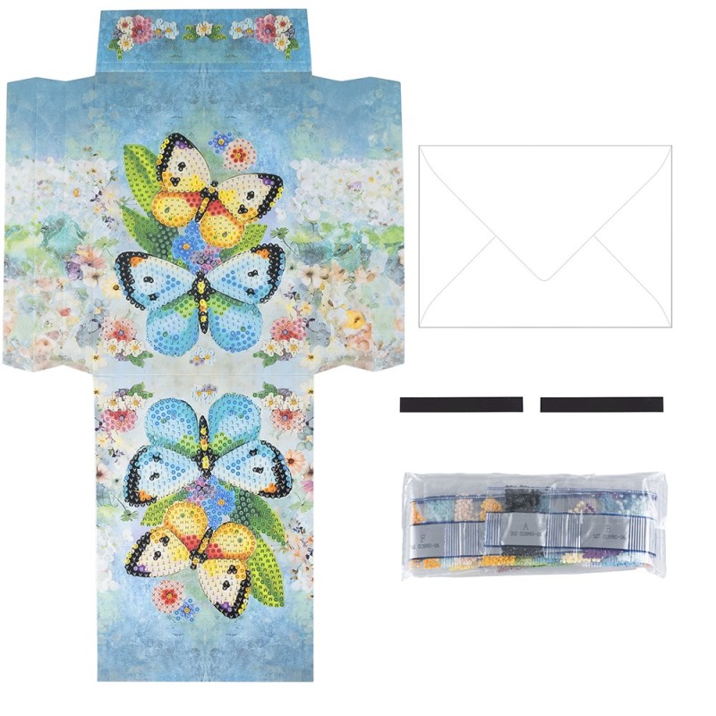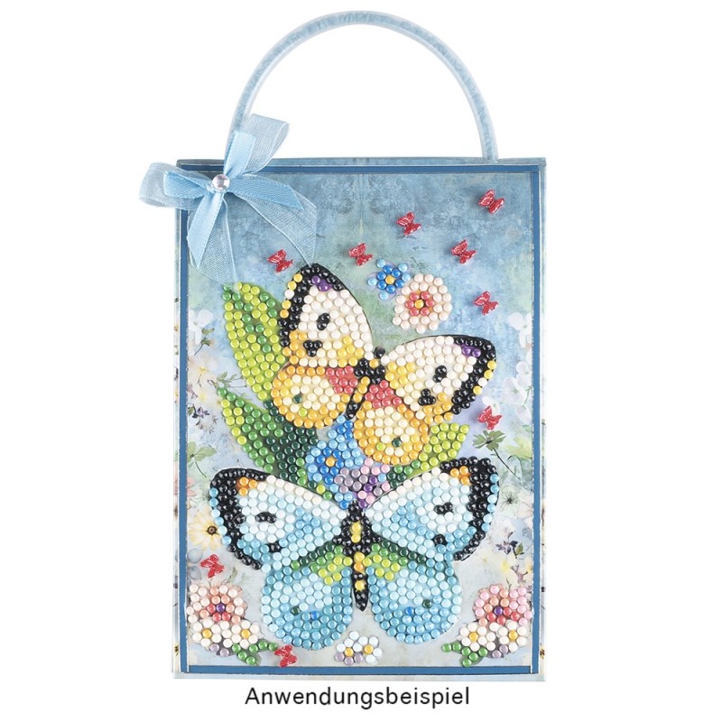 Torebka prezentowa w formie kartki z obrazem diamentowym, Motyle, gramatura 370 g/m², wysokość 36,5 cm, zawiera kopertę i pasek magnetyczny. Twórz wyrafinowane torby na prezenty w praktycznym formacie kartki okolicznościowej z pięknymi motywami malarstwa diamentowego. Otrzymasz również pasujące koperty, dzięki którym będziesz mógł od razu wysłać swoje gotowe dzieła sztuki. Aby wykonać torby na prezenty, wykonaj następujące czynności: Rozłożona torba na prezenty jest całkowicie pokryta folią ochronną, która chroni zarówno powierzchnie, które mają być pokryte kamieniami, jak i samoprzylepne zakładki po bokach. Aby móc ułożyć motyw, należy przeciąć folię na nieprzylepnym obszarze pomiędzy motywem a zakładkami samoprzylepnymi po lewej i prawej stronie. Teraz możesz odklejać folię z motywu kawałek po kawałku podczas nakładania kamieni, a samoprzylepne paski po bokach pozostaną chronione. Następnie całkowicie pokryj oba motywy kamieniami szlachetnymi. Aby to zrobić, wybierz kamienie, które chcesz umieścić zgodnie z nazwą. Każdemu wydrukowanemu numerowi przypisany jest odcień koloru. Usuń folię ochronną z motywu kawałek po kawałku i przykryj samoprzylepną powierzchnię kamieniami. Jeśli chcesz, możesz trwale umieścić kamienie za pomocą naszego najwyższej jakości uszczelniacza do kryształków. Po całkowitym rozłożeniu obu motywów złóż kartkę z życzeniami wzdłuż wstępnie rowkowanych linii. Złóż panel przedni i boczne do tyłu i zdejmij folię ochronną z zakładek samoprzylepnych. Teraz przymocuj elementy boczne do przodu, aby utworzyć kieszeń. Następnie złóż zakładkę zamykającą z przodu. Aby móc zamknąć torebkę prezentową klapką, należy przykleić jeden z samoprzylepnych pasków magnetycznych po wewnętrznej stronie klapki zamykającej oraz do torby. Oznacza to, że możesz otwierać i zamykać torbę wielokrotnie. Torba prezentowa idealnie nadaje się do pakowania małych i płaskich przedmiotów, zdjęć, prezentów pieniężnych lub samodzielnie zaprojektowanych kartek okolicznościowych. Twoja kreatywność nie zna granic! Uwaga: narzędzia nie są dołączone!