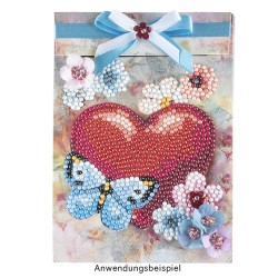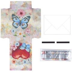 Torebka prezentowa w formie kartki z obrazem diamentowym, Serce z motylem, gramatura 370 g/m², wysokość 36,5 cm, zawiera kopertę i pasek magnetyczny. Twórz wyrafinowane torby na prezenty w praktycznym formacie kartki okolicznościowej z pięknymi motywami malarstwa diamentowego. Otrzymasz również pasujące koperty, dzięki którym będziesz mógł od razu wysłać swoje gotowe dzieła sztuki. Aby wykonać torby na prezenty, wykonaj następujące czynności: Rozłożona torba na prezenty jest całkowicie pokryta folią ochronną, która chroni zarówno powierzchnie, które mają być pokryte kamieniami, jak i samoprzylepne zakładki po bokach. Aby móc ułożyć motyw, należy przeciąć folię na nieprzylepnym obszarze pomiędzy motywem a zakładkami samoprzylepnymi po lewej i prawej stronie. Teraz możesz odklejać folię z motywu kawałek po kawałku podczas nakładania kamieni, a samoprzylepne paski po bokach pozostaną chronione. Następnie całkowicie pokryj oba motywy kamieniami szlachetnymi. Aby to zrobić, wybierz kamienie, które chcesz umieścić zgodnie z nazwą. Każdemu wydrukowanemu numerowi przypisany jest odcień koloru. Usuń folię ochronną z motywu kawałek po kawałku i przykryj samoprzylepną powierzchnię kamieniami. Jeśli chcesz, możesz trwale umieścić kamienie za pomocą naszego najwyższej jakości uszczelniacza do kryształków. Po całkowitym rozłożeniu obu motywów złóż kartkę z życzeniami wzdłuż wstępnie rowkowanych linii. Złóż panel przedni i boczne do tyłu i zdejmij folię ochronną z zakładek samoprzylepnych. Teraz przymocuj elementy boczne do przodu, aby utworzyć kieszeń. Następnie złóż zakładkę zamykającą z przodu. Aby móc zamknąć torebkę prezentową klapką, należy przykleić jeden z samoprzylepnych pasków magnetycznych po wewnętrznej stronie klapki zamykającej oraz do torby. Oznacza to, że możesz otwierać i zamykać torbę wielokrotnie. Torba prezentowa idealnie nadaje się do pakowania małych i płaskich przedmiotów, zdjęć, prezentów pieniężnych lub samodzielnie zaprojektowanych kartek okolicznościowych. Twoja kreatywność nie zna granic! Uwaga: narzędzia nie są dołączone!