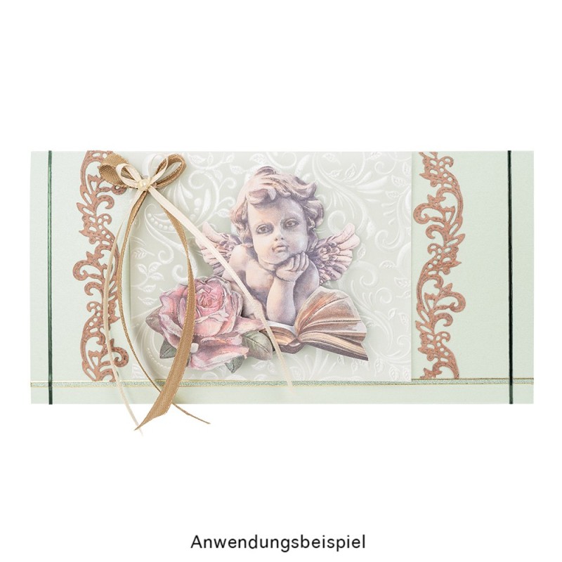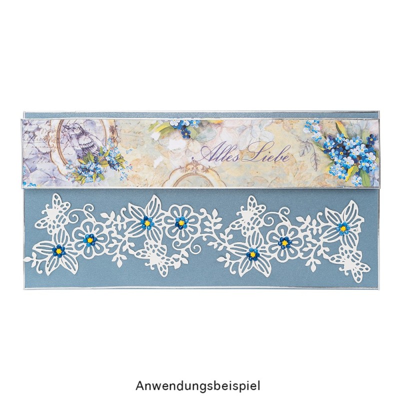 Umieść wykrojnik pod papierem do wykrawania stroną tnącą do góry i umieść wszystko między płytkami, jak wskazano w instrukcji maszyny. Teraz stos wprowadź do maszynki, jak wskazano, następnie usuń plastikowe płytki i wyjmij wycięty papier.
