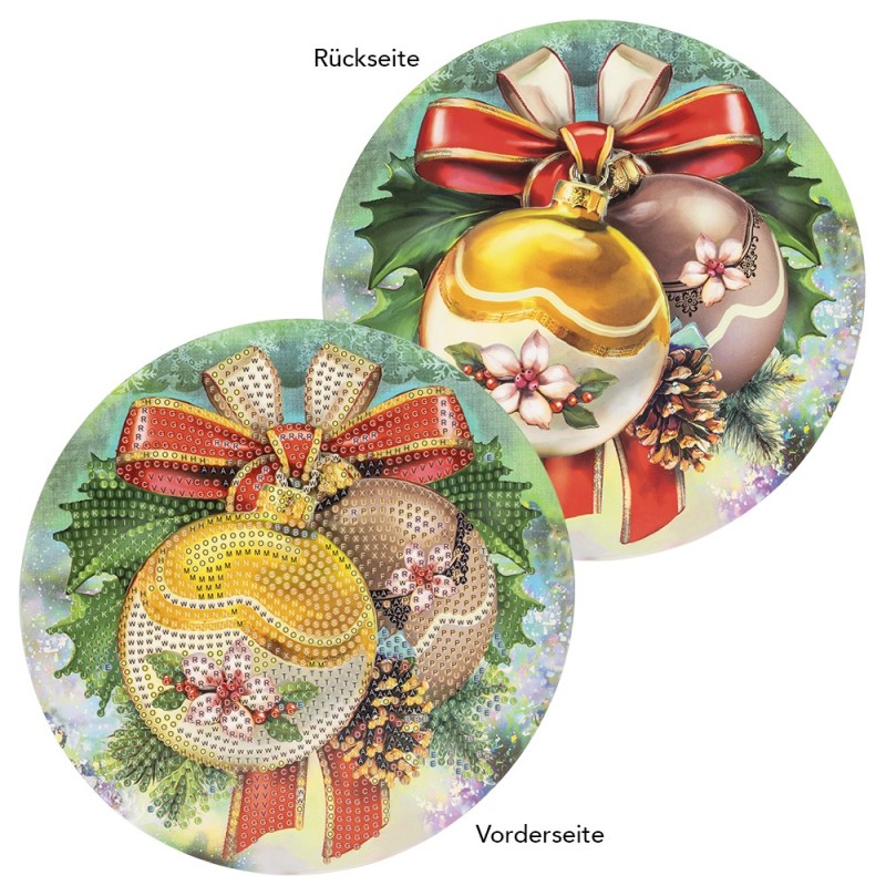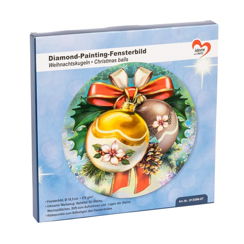 Dekoracja okienna do malowania diamentami, Bombki 18,3 cm, 370 g/m², dwustronny nadruk do dwustronnego pokrycia diamentowymi kamieniami malarskimi (w zestawie pasujące kamienie), z oczkami do zawieszenia.