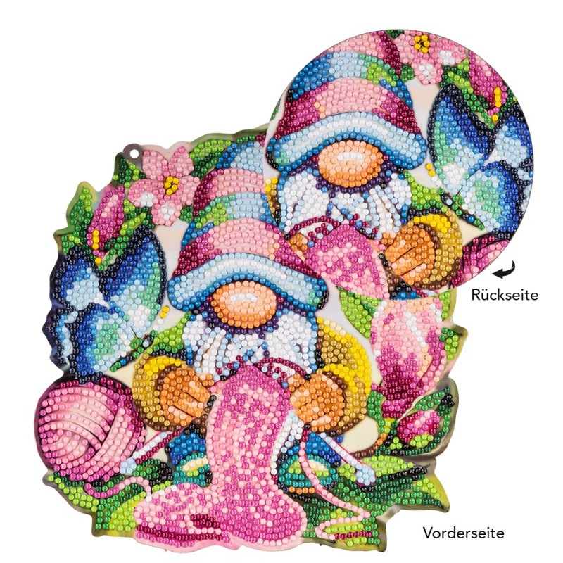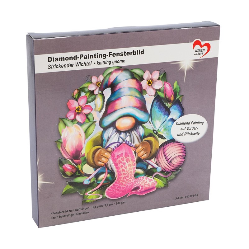 Dekoracja okienna do malowania diamentami, Krasnal, 19,6 cm x 19,8 cm, 800 g/m², dwustronny nadruk do dwustronnego pokrycia diamentowymi kamieniami malarskimi (w zestawie pasujące kamienie), z oczkami do zawieszenia.