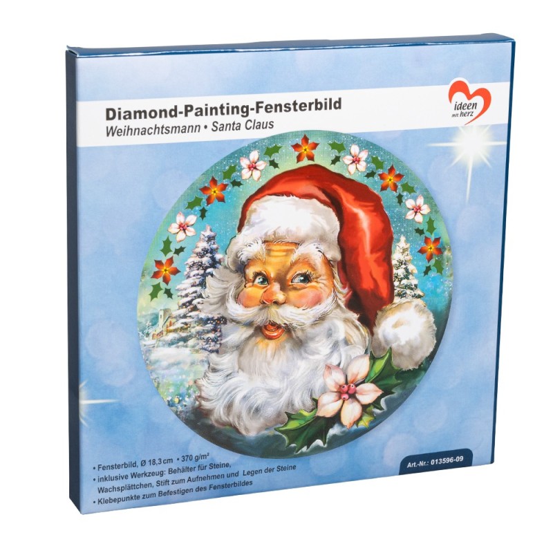 Dekoracja okienna do malowania diamentami, Mikołaj 18,3 cm, 370 g/m², dwustronny nadruk do dwustronnego pokrycia diamentowymi kamieniami malarskimi (w zestawie pasujące kamienie), z oczkami do zawieszenia.